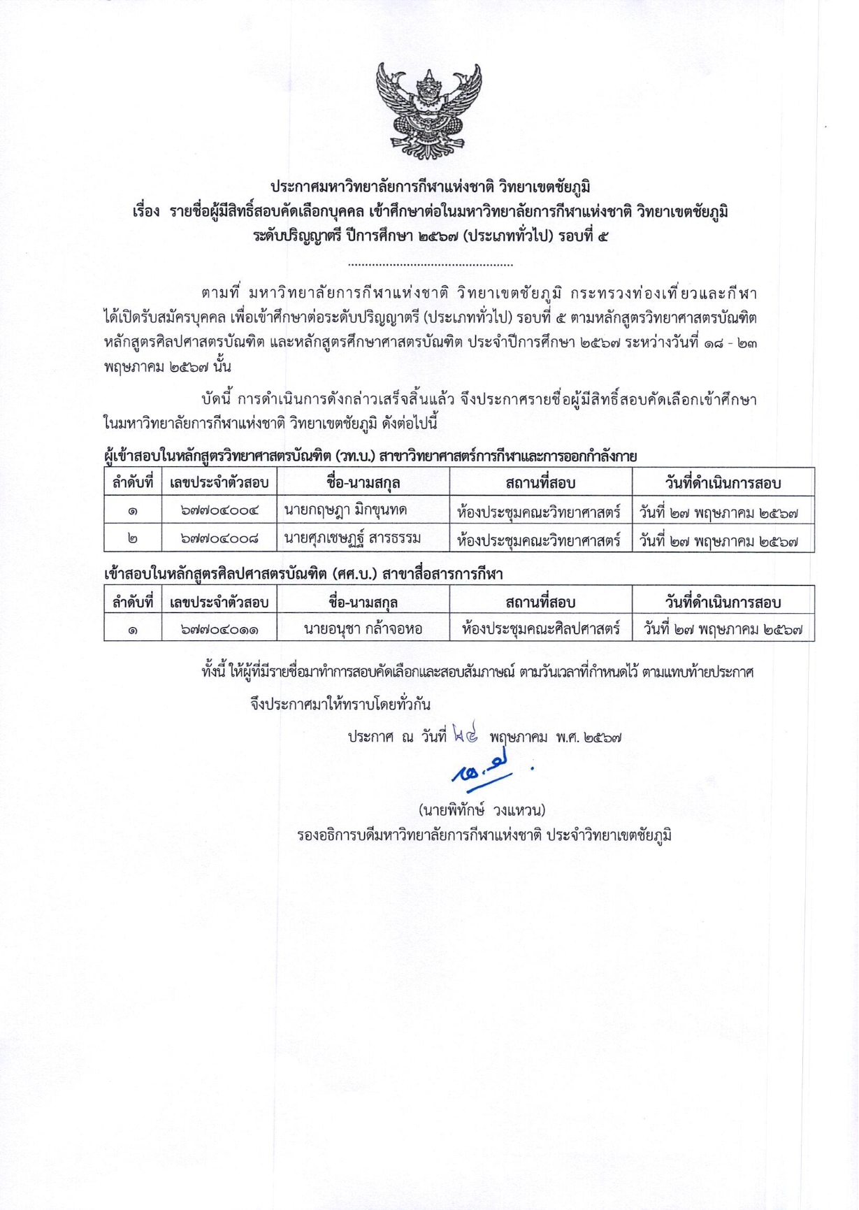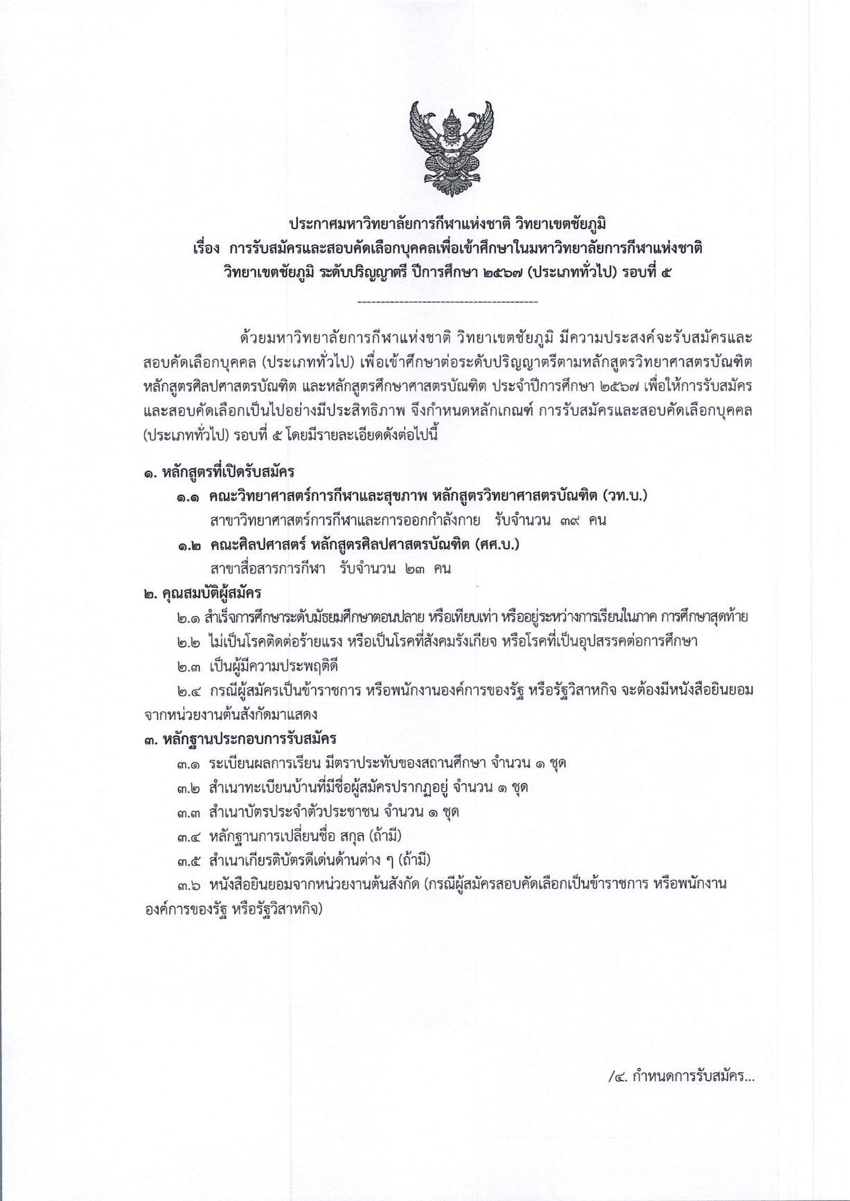 ประกาศ การรับสมัครและสอบคัดเลือกบุคคลเพื่อเข้าศึกษาในมหาวิทยาลัยการกีฬาแห่งชาติ วิทยาเขตชัยภูมิ ระดับปริญญาตรี ปีการศึกษา2567 (ประเภททั่วไป) รอบที่5