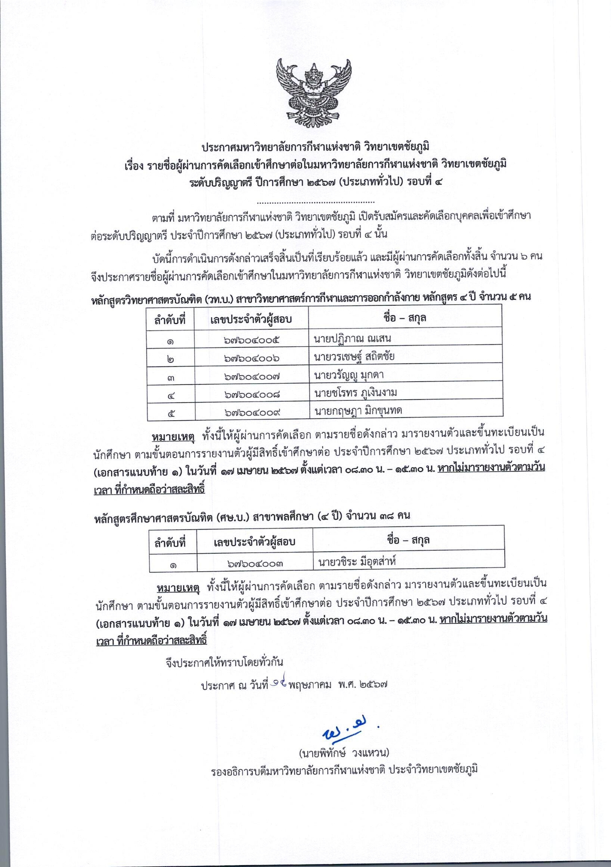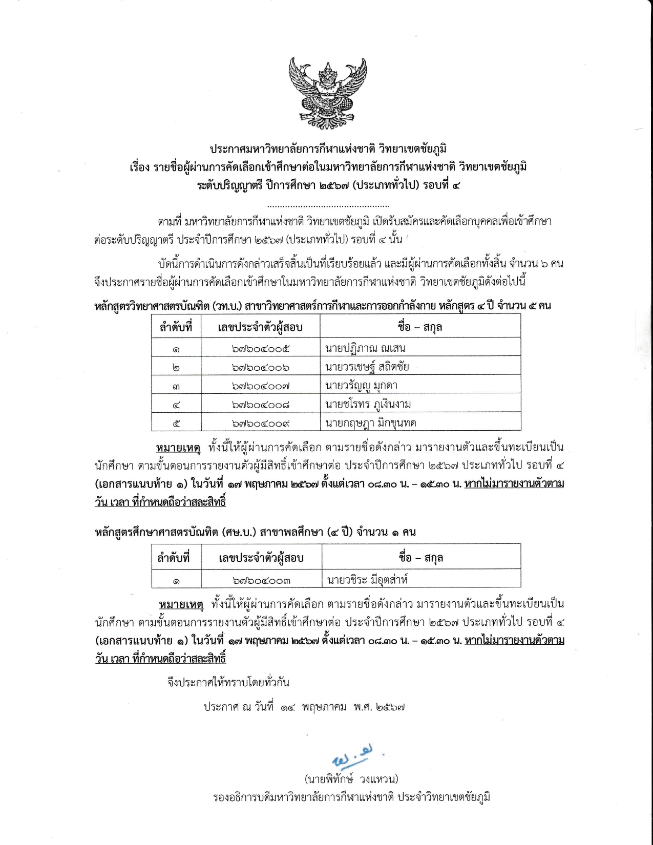 ประกาศ รายชื่อผู้ผ่านการคัดเลือกเข้าศึกษาต่อในมหาวิทยาลัยการกีฬาแห่งชาติ วิทยาเขตชัยภูมิ ปีการศึกษา2567 (ประเภททั่วไป) รอบที่4